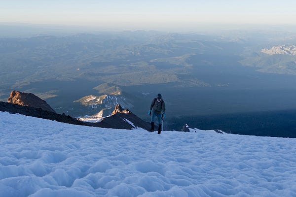 Above: our intrepid hero traverses the upper slopes of Mt. Shasta